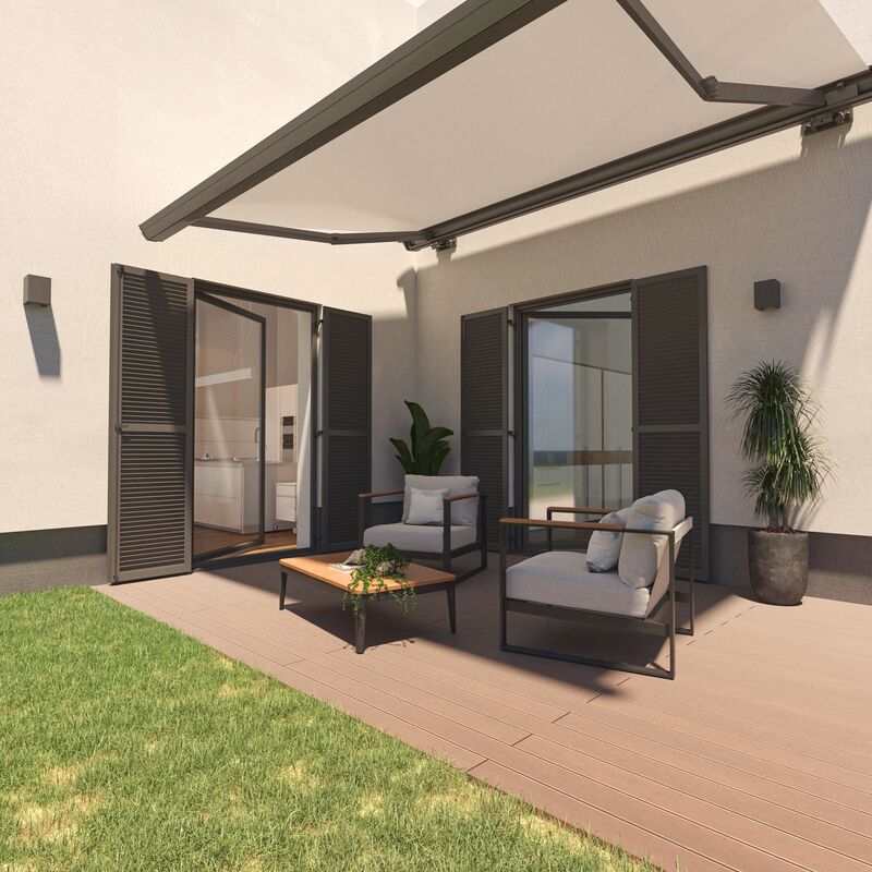 Robuste Markisen für Terrassen und Balkone, die vor Sonne und Regen schützen und gleichzeitig den Aufenthalt im Freien komfortabel machen.